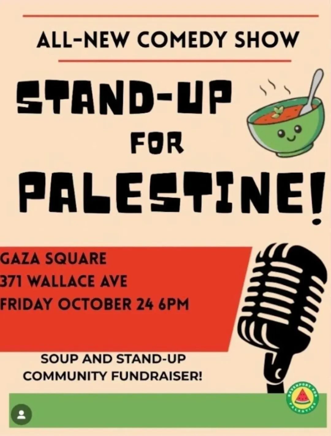 Get ready for a cozy night of soup, stand-up comedy and community! Laugh It Forward alums come together for a fundraising comedy show in support of Davenport 4 Palestine—with plenty of stand-up laughs and delicious soup to kick things off.